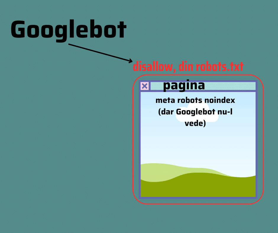 Și dacă nu crawluiește (deci dacă nu intră pe pagină efectiv) nu are nici ocazia să vadă meta robots noindex.