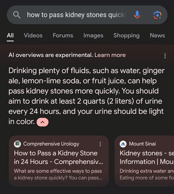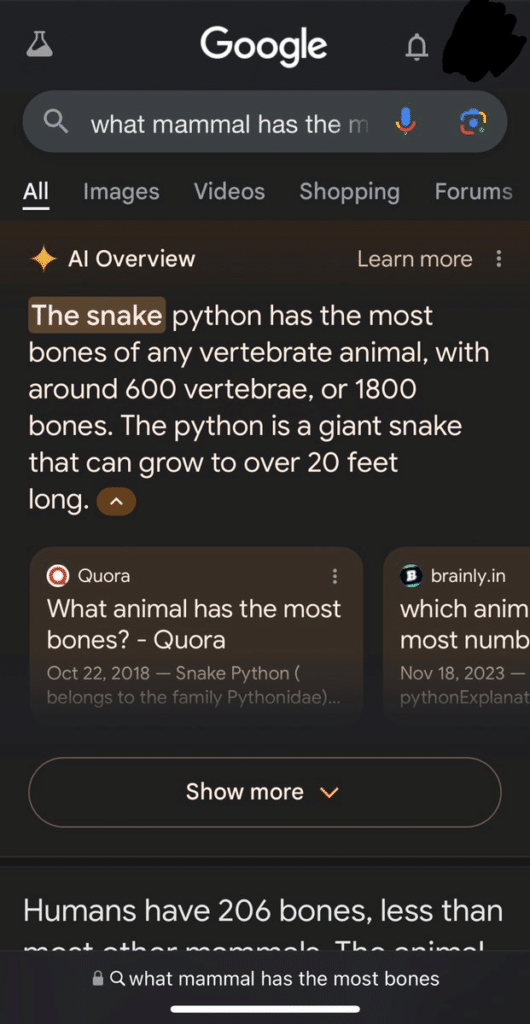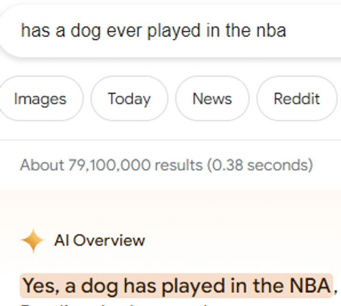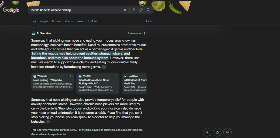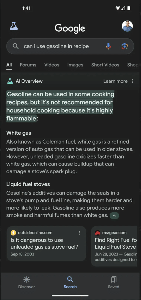 Se pare că gigantul tehnologic a lansat oarecum în grabă această funcționalitate din rezultatele de căutare. Motivul poate fi lansarea Chat GPT 4o de săptămânile trecute, sau pur și simplu pentru că asta trebuia să se întâmple la conferința IO. Oricum ar fi, cert este că a apărut o sumedemie de erori – cum era și de așteptat – care au creat momente hilare pentru vizitatorii din motorul de căutare.